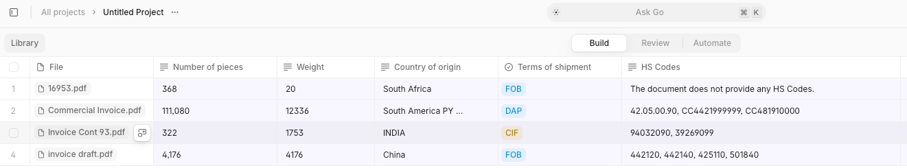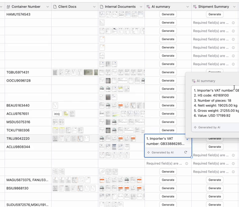 - Extract some key details such as VAT Numbers, HS Codes, Values, and Weights that could be useful for automating shipping documents