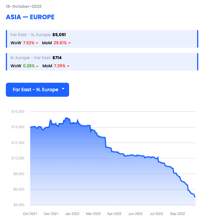 Report a figure of $5,051 per 40’ container (FEU) dated 18/10/22 (down 7.52% WoW)