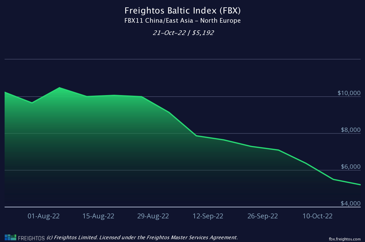 Report a figure of $5,192 per 40’ container (FEU) dated 21/10/22 (down 14% WoW)
