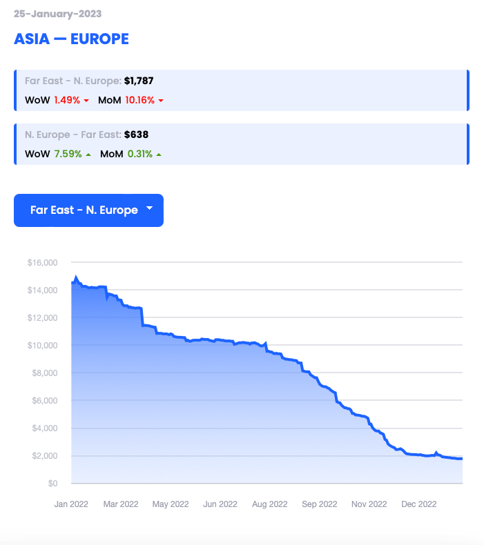 Report a figure of $1,787 per 40’ container (FEU) dated 25/01/23 (down 1.49% WoW)