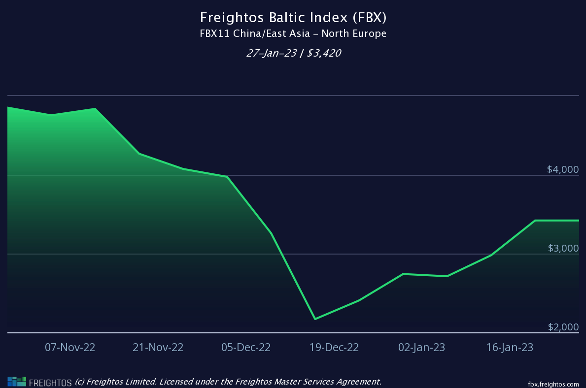 Report a figure of $3,420 per 40’ container (FEU) dated 27/01/23 (up 0% WoW)