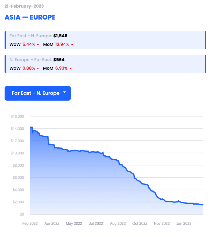 Report a figure of $1,548 per 40’ container (FEU) dated 21/02/23 (down 5.44% WoW)