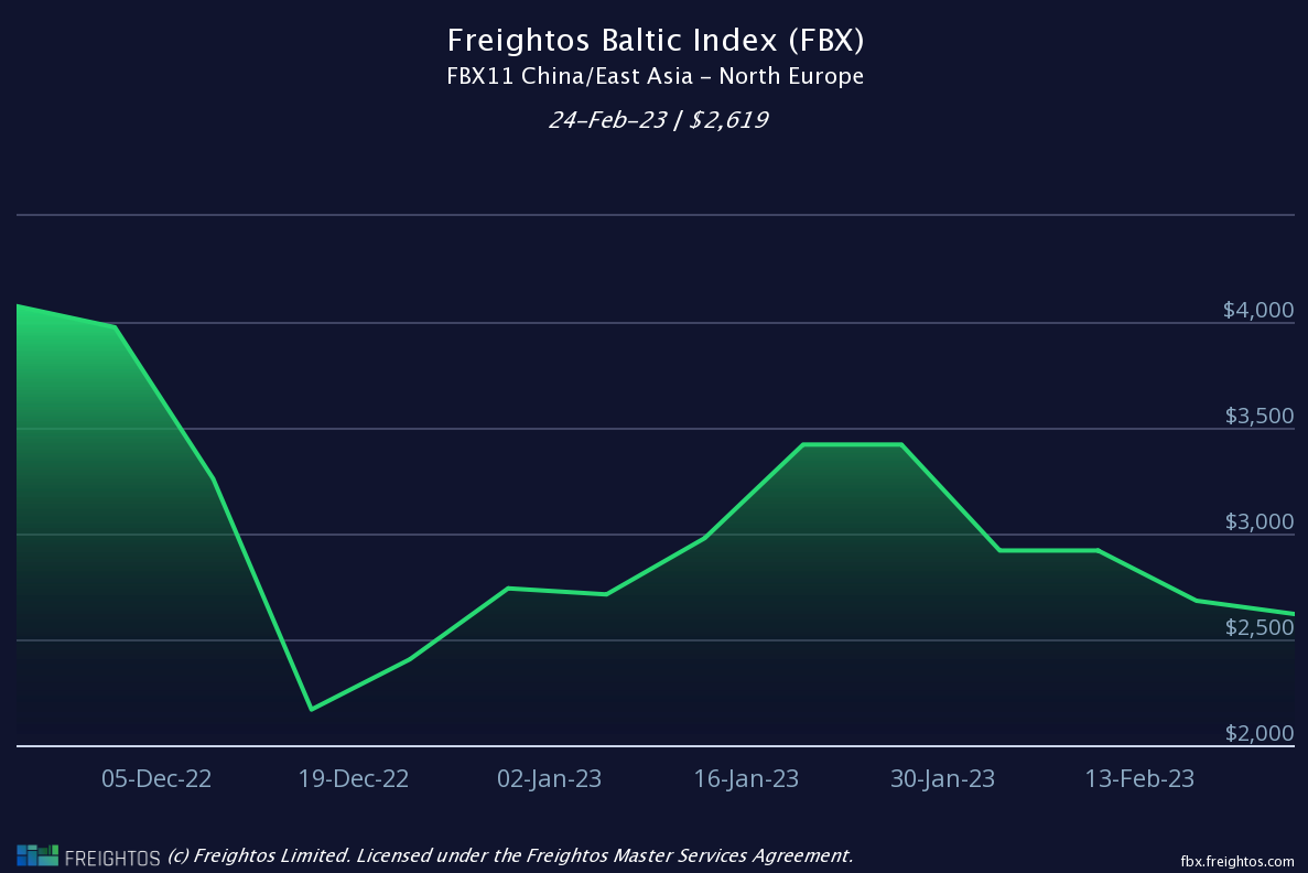 Report a figure of $2,619 per 40’ container (FEU) dated 24/02/23 (down 8% WoW)