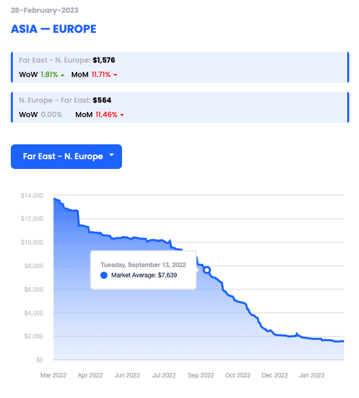 Report a figure of $1,576 per 40’ container (FEU) dated 28/02/23 (up 1.81% WoW)
