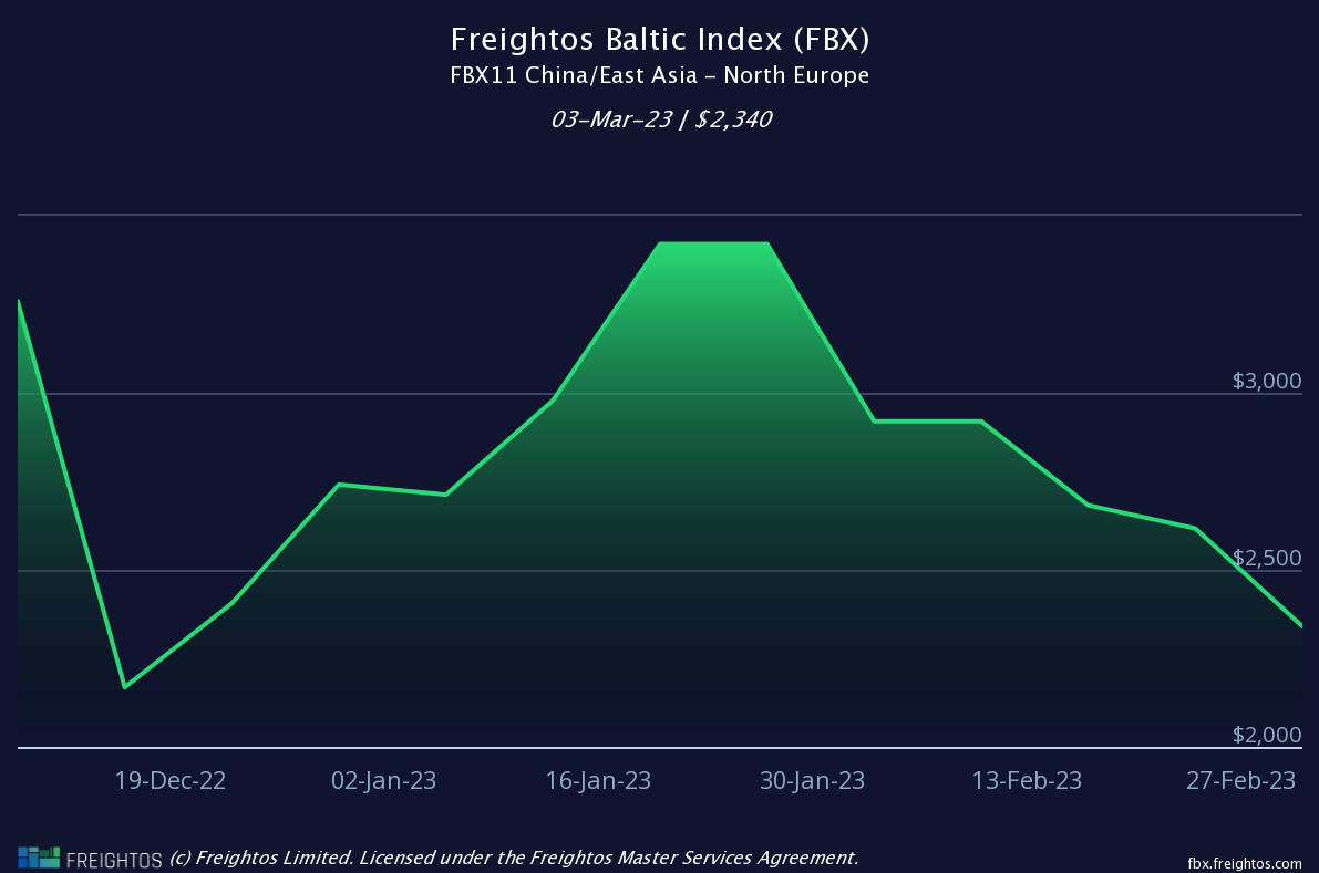 Report a figure of $2,340 per 40’ container (FEU) dated 03/03/23 (down 2% WoW)