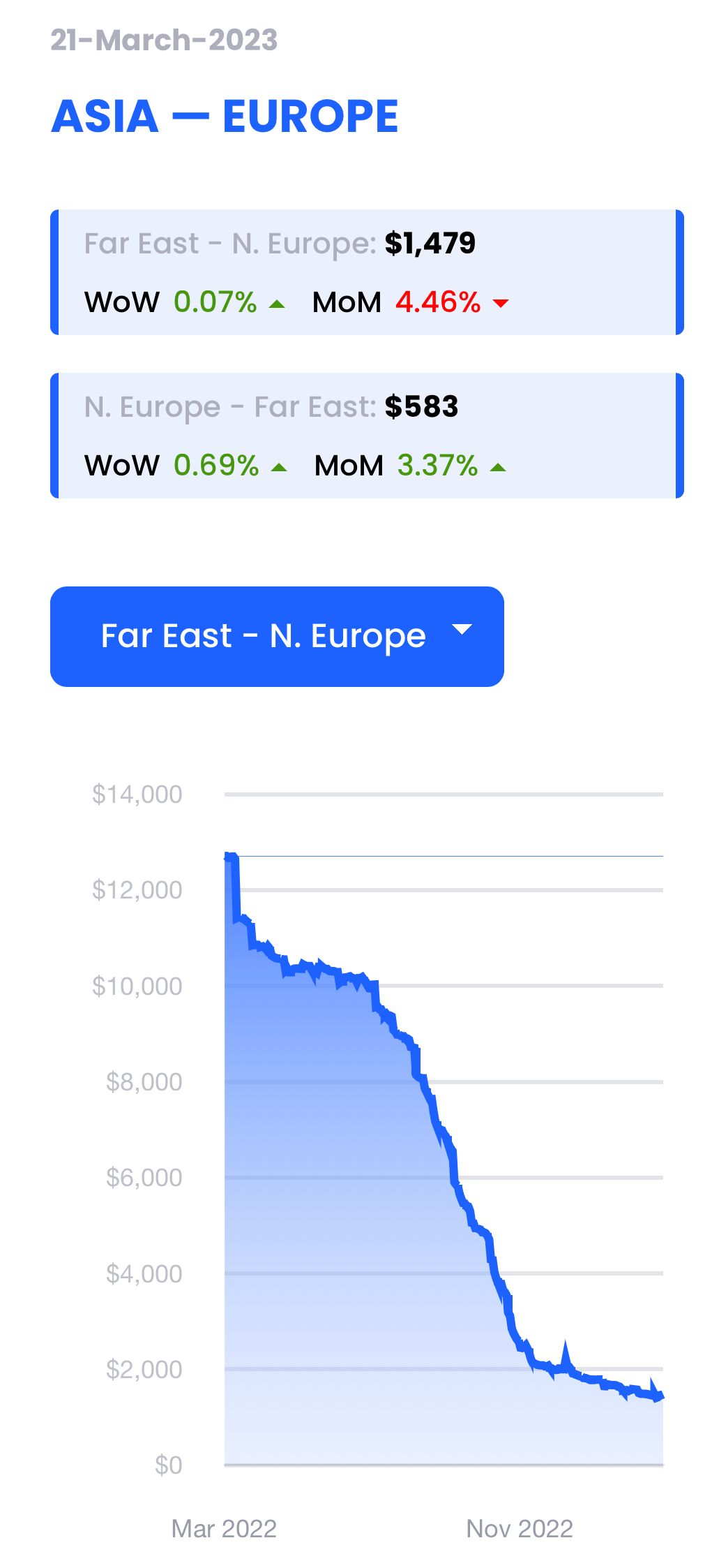 Report a figure of $1,479 per 40’ container (FEU) dated 21/03/23 (up 0.07% WoW)