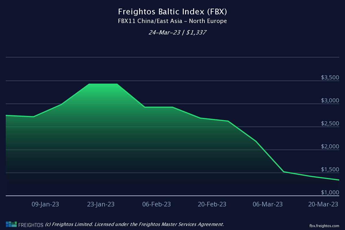 Report a figure of $1,337 per 40’ container (FEU) dated 24/03/23 (down 7% WoW)