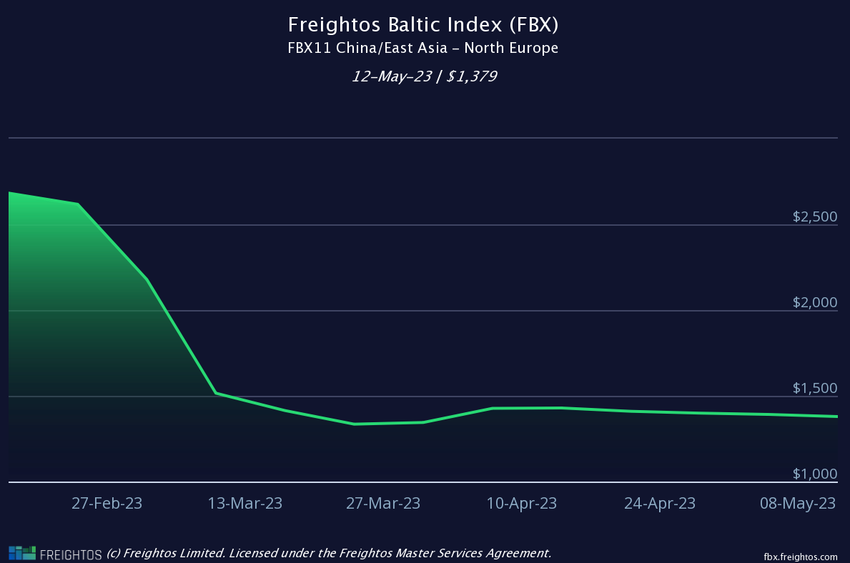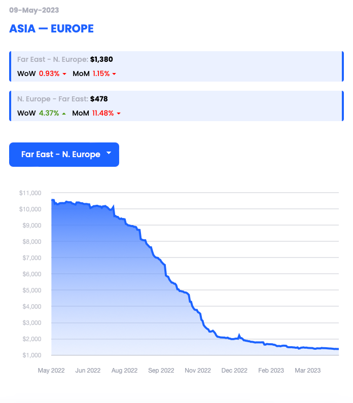 Report a figure of $1,380 per 40’ container (FEU) dated 09/05/23 (down 0.93% WoW)