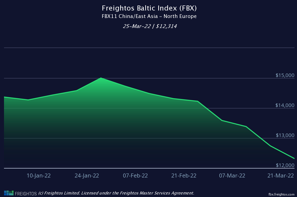 Report a figure of $12,314 per 40’ container (FEU) dated 25/03/22 (down 3%)