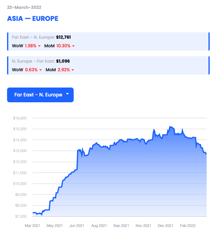 Report a figure of $12,761 per 40’ container (FEU) dated 22/03/22 (down 1.38%)