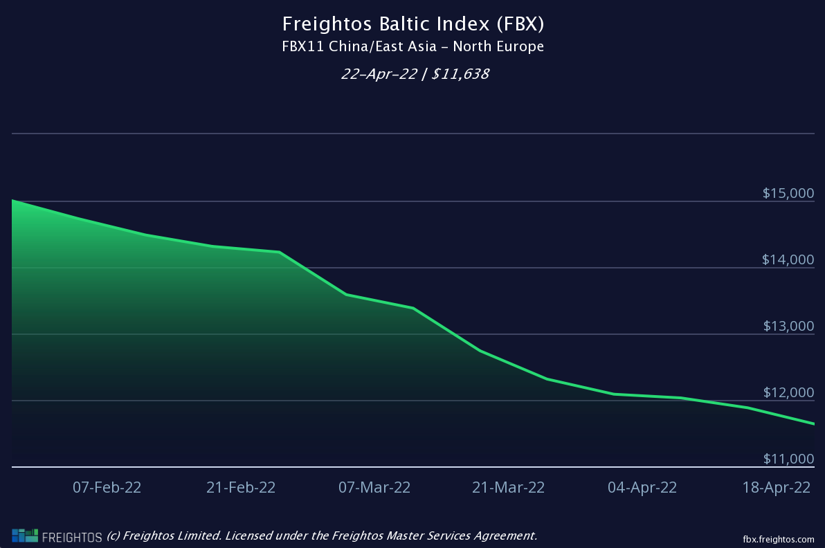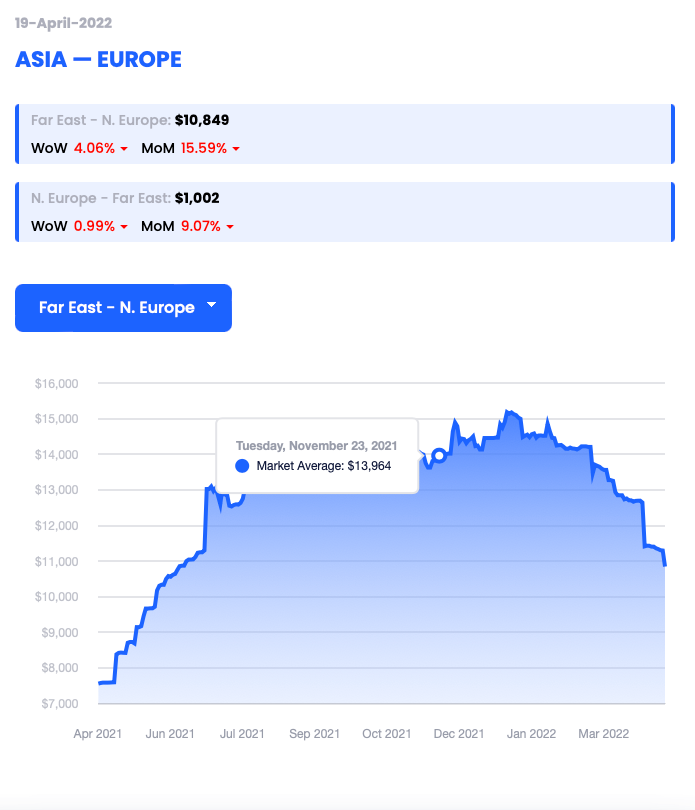 Report a figure of $10,849 per 40’ container (FEU) dated 19/04/22 (down 4.06% WoW)