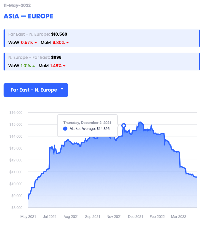 Report a figure of $10,569 per 40’ container (FEU) dated 11/05/22 (down 0.57% WoW)