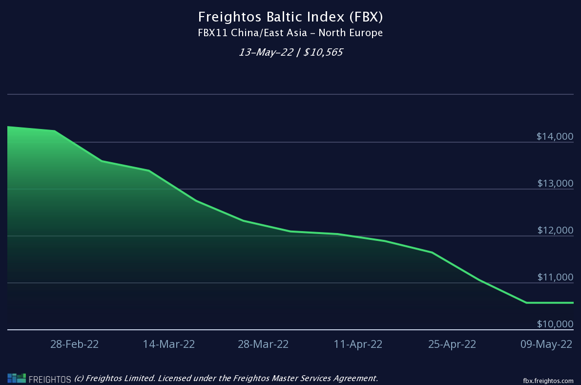 Report a figure of $10,565 per 40’ container (FEU) dated 13/05/22 (down 0% WoW)