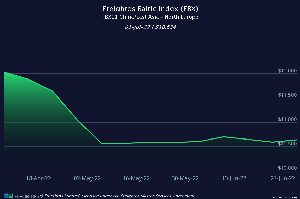 Report a figure of $10,307 per 40’ container (FEU) dated 28/06/22 (down 0.44% WoW)
