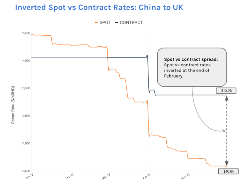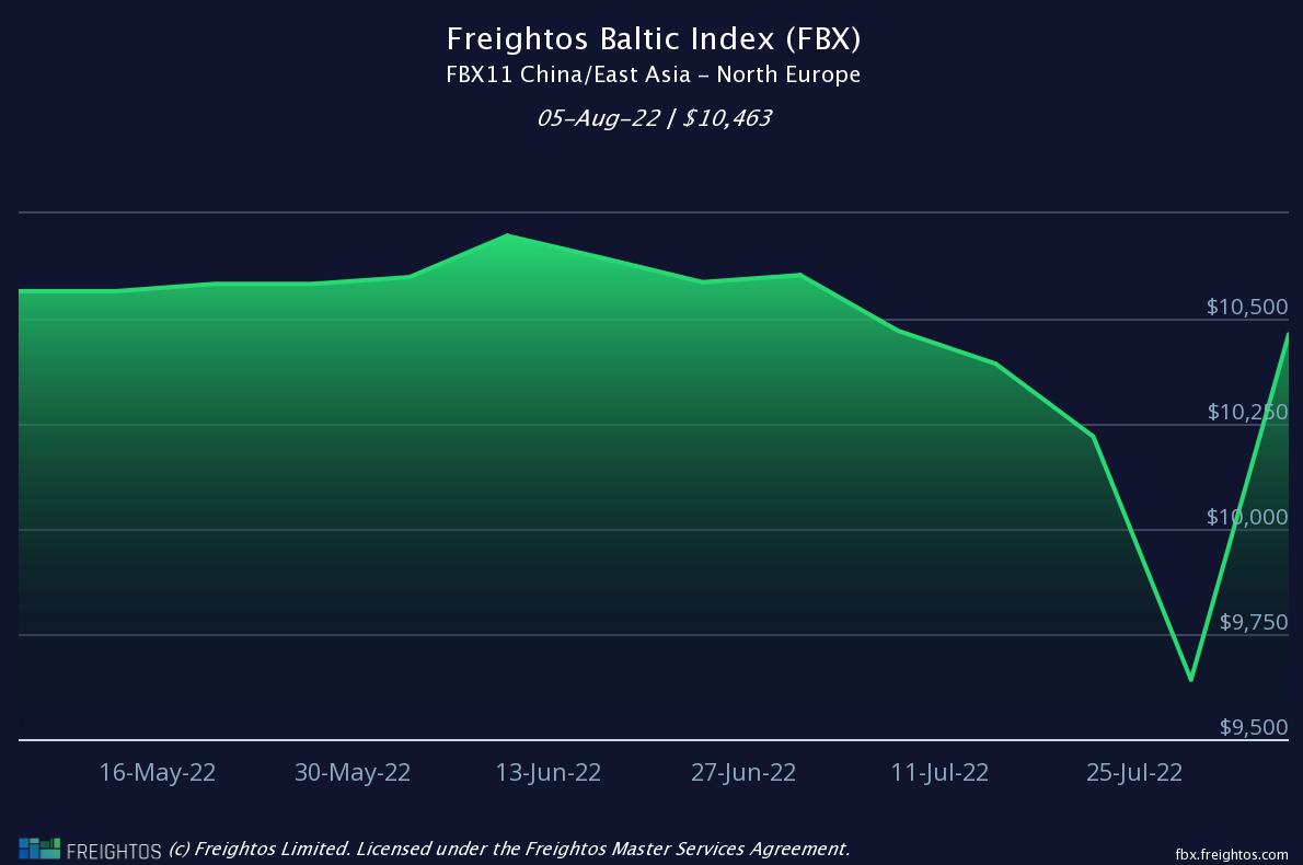 Report a figure of $10,463 per 40’ container (FEU) dated 05/08/22 (up 9% WoW)