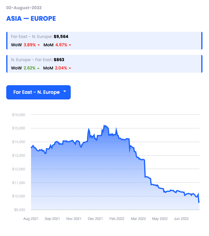 Report a figure of $9,564 per 40’ container (FEU) dated 02/08/22 (down 3.89% WoW)