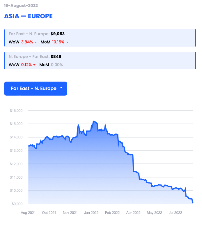 Report a figure of $9,053 per 40’ container (FEU) dated 016/08/22 (down 3.84% WoW)