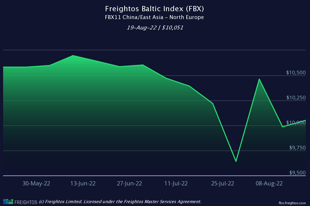 Report a figure of $10,051 per 40’ container (FEU) dated 19/08/22 (up 1% WoW)