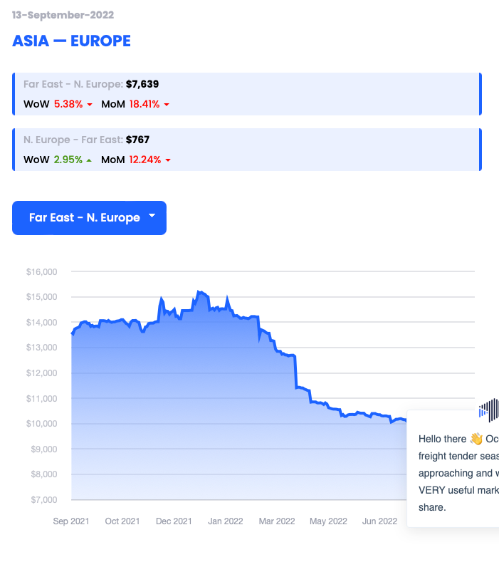 Report a figure of $7,639 per 40’ container (FEU) dated 13/09/22 (down 5.38% WoW)