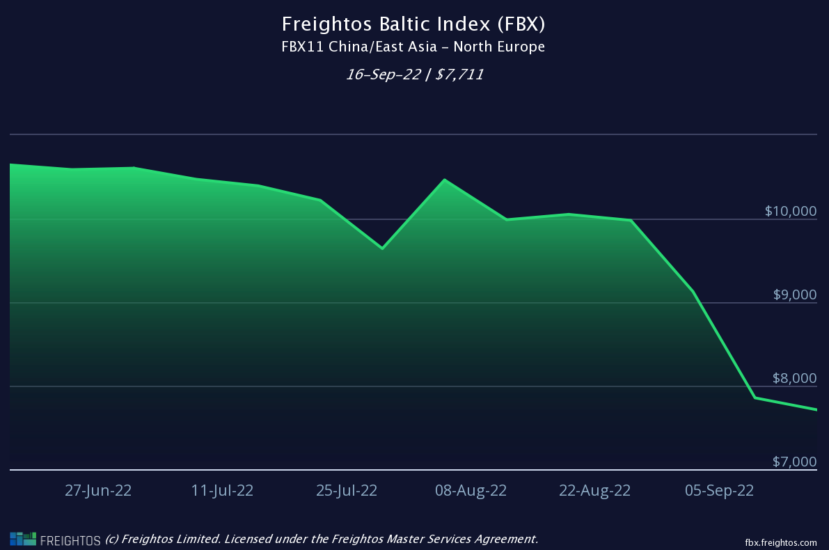 Report a figure of $7,854 per 40’ container (FEU) dated 16/09/22 (down 14% WoW)