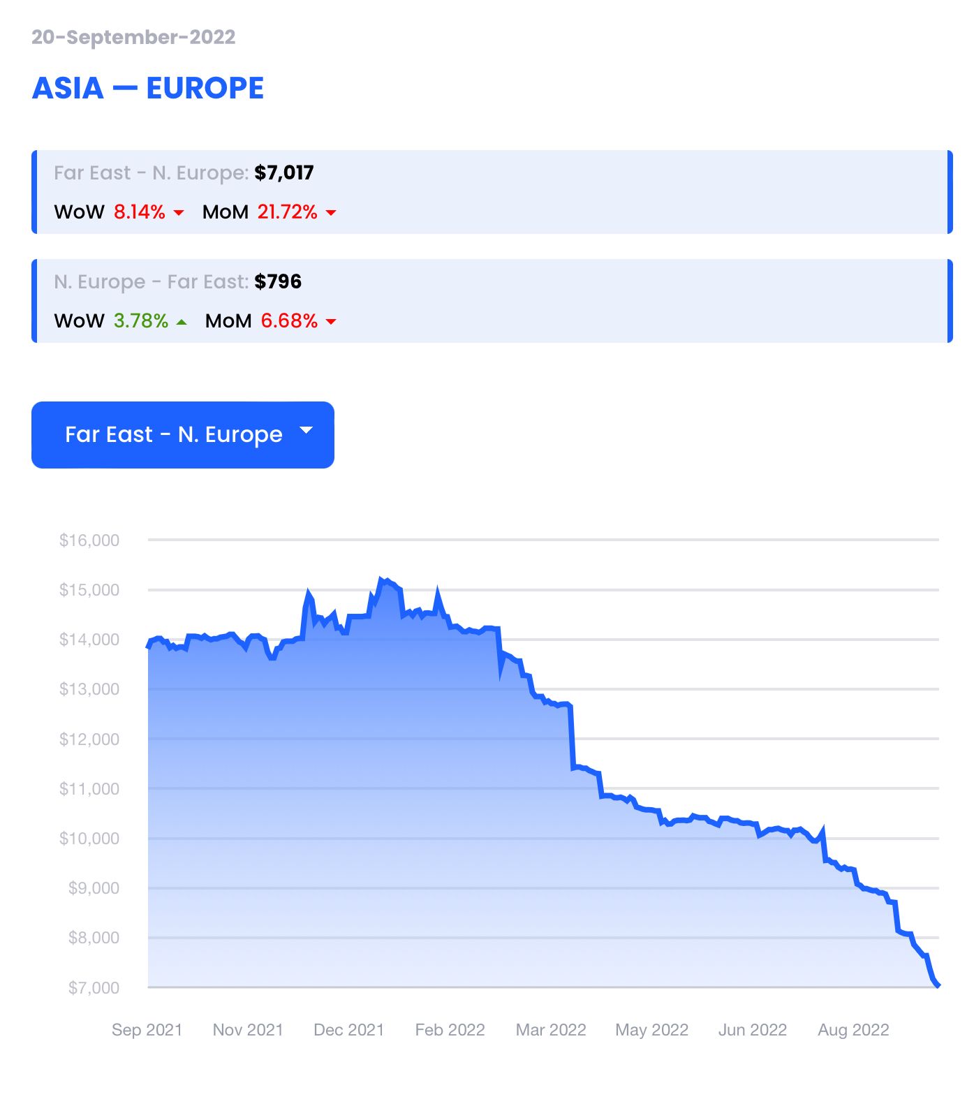 Report a figure of $7,017 per 40’ container (FEU) dated 20/09/22 (down 8.14% WoW)