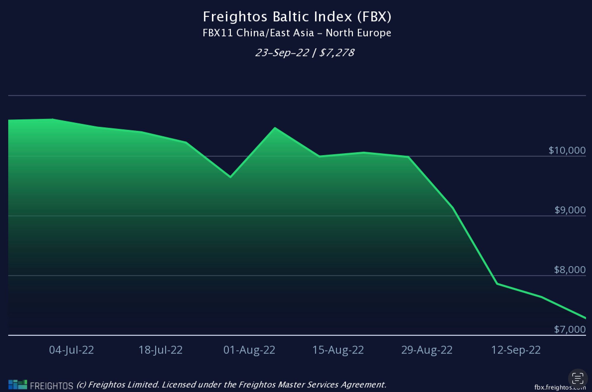 Report a figure of $7,278 per 40’ container (FEU) dated 23/09/22 (down 5% WoW)