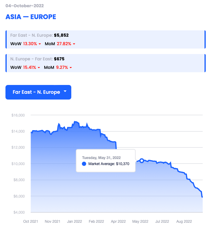 Report a figure of $5,852 per 40’ container (FEU) dated 04/10/22 (down 13.30% WoW)