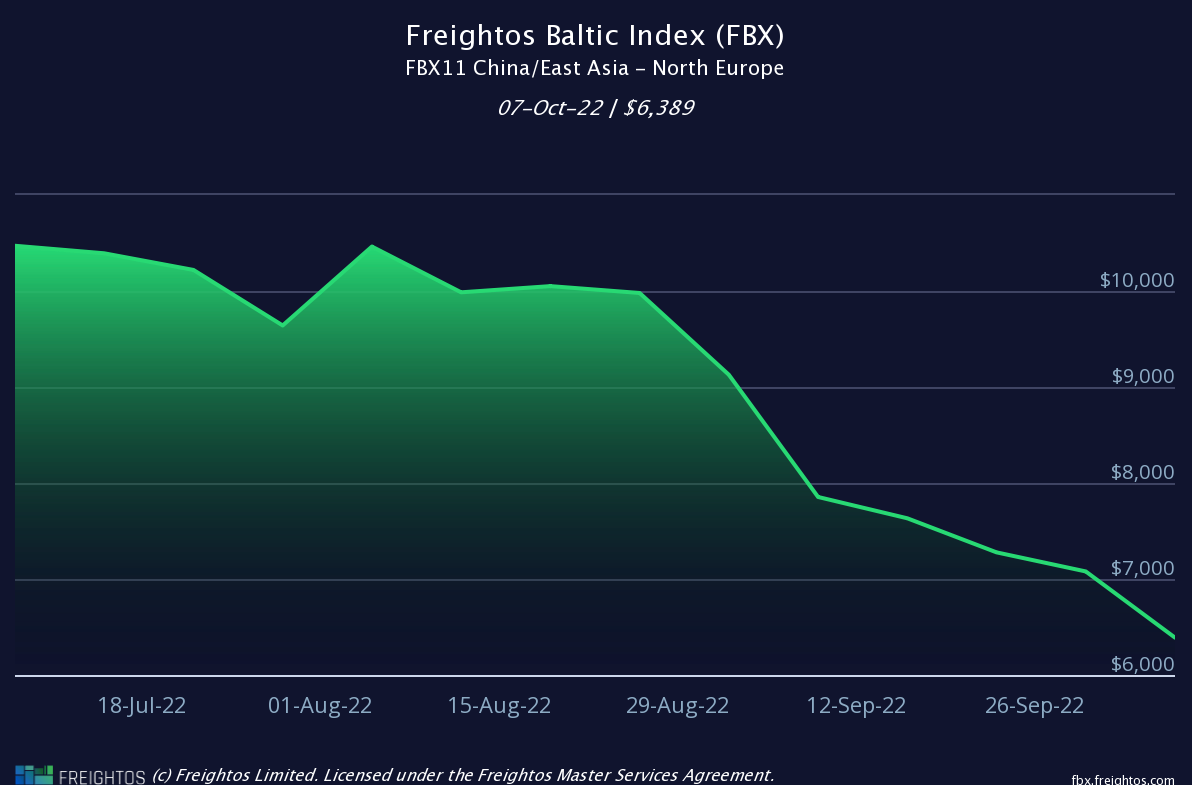 Report a figure of $6389 per 40’ container (FEU) dated 07/10/22 (down 3% WoW)