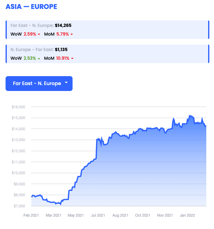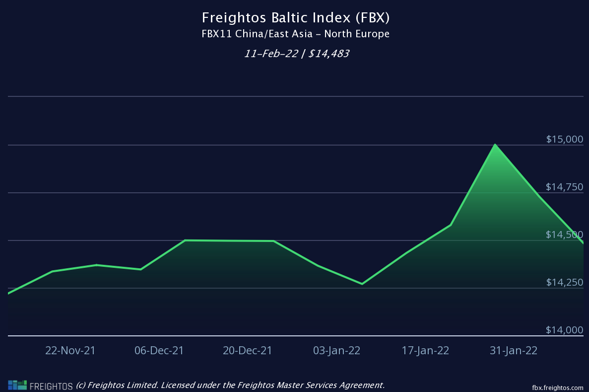 Report a figure of $14,483 per 40’ container (FEU) dated 11/02/22 (down 2%)