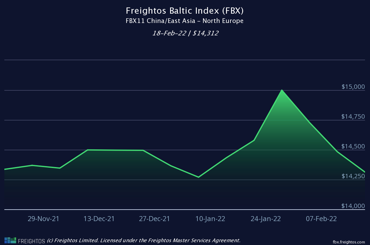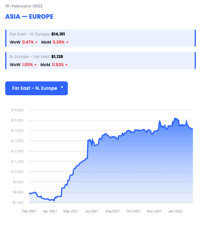 Report a figure of $14,191 per 40’ container (FEU) dated 15/02/22 (down 0.47%)